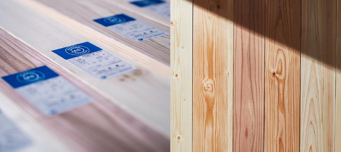 ティンバラムでは、東北を中心とした国産材のスギ、カラマツ、ヒノキ、アカマツ、トドマツをはじめ、輸入材のスプルース、オウシュウアカマツを使い、JAS認証工場が誇る質の高い集成材を安定供給しています。お客様の地元の「地域材」での集成材作りにも積極的に取り組んでいます。